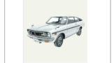 作品は、ダット自動車製造ダットサン第1号車が描かれています。T型フォードのデザインを手本にしており、流れるようなフェンダーラインの美しい曲線が特徴的です。