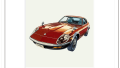 この作品も室内をはっきり見せたかったのか、窓が開いた状態で描かれており、ボディサイドに光の陰影をつけ、スカイラインの美しいボディサイドの曲線美を表現しています。